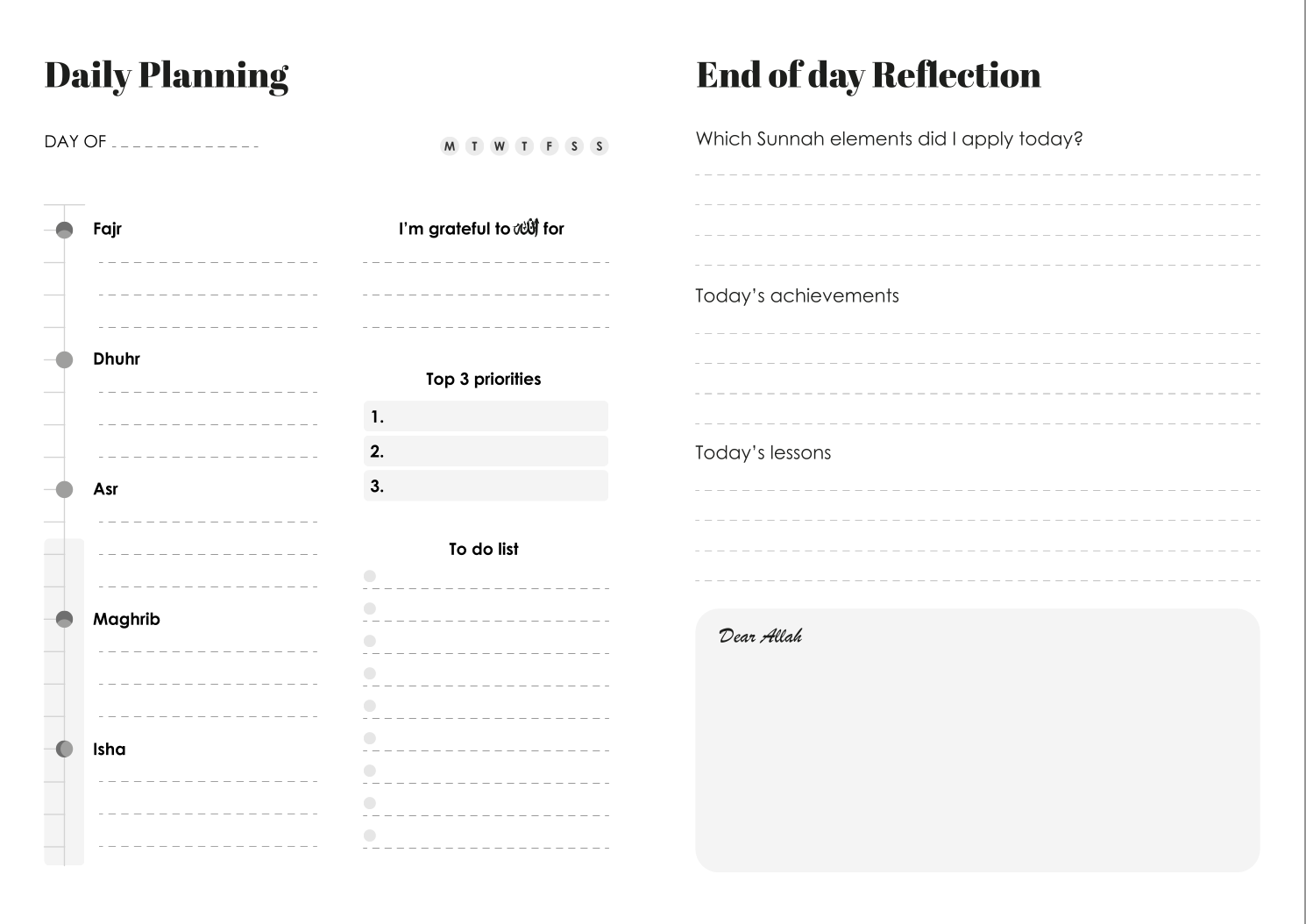 Notre planner est le choix parfait, avec des versets coraniques et des hadiths quotidiens qui rendent la pratique spirituelle facile et accessible.